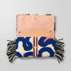 This stunning oversized clutch is a true statement piece, featuring a bold hand-tufted design with an abstract wavy pattern in royal blue, cream, and coral pink. The eye-catching beaded eye embellishment on the front adds a unique artistic touch that sets this piece apart.