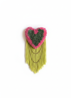 Méticuleusement tuftée à la main et ornée de luxueuses franges soyeuses, cette broche met en valeur la beauté de la mode éthique et des techniques textiles traditionnelles.