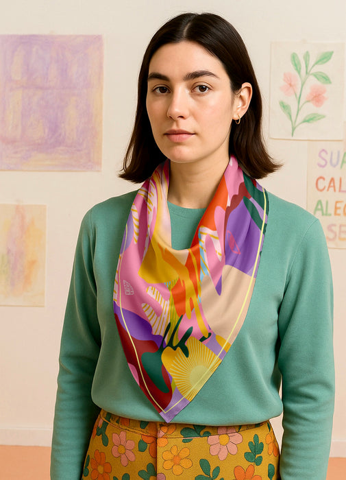 NEW! Featuring a double-sided print with vivid, luminous colours and a subtle sheen, this scarf presents an original design by Manuela Jarry for Dora Nola. Its artistic and elegant expression makes it an artful accessory, thoughtfully packaged in a luxury gift box—perfect for those who appreciate bold yet sophisticated style.